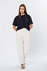Посадка высокая, на поясе — мягкая резинка, образующая лёгкие сборки и обеспечивающая комфорт. В области бёдер брюки свободные.